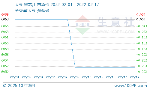 据生意社监测数据显示:春节过后,国产大豆购销冷清,行情依旧保持弱势平稳运行,截止2月17日,国产大豆市场均价将6052元/吨,较2月初,价格下跌0.26%。