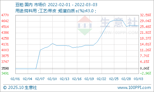 据生意社数据监测显示:3月3日,豆粕市场均价4536元/吨,现货市场价格小幅下调。春节过后豆粕价格一直大幅上涨,突破历史高位,突破4000元大关,到了3月更是来到4500元/吨。由于终端生猪价格持续下滑,豆粕价格居高不下,抑制成交,价格陆续理性回调。预测:短期内豆粕现货市场仍将窄幅整理。