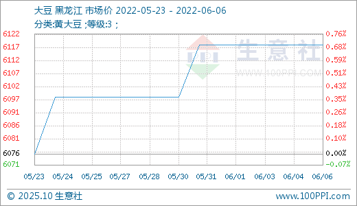据生意社监测数据显示:5月下旬开始,国产大豆稳中小涨,端午节过后国产大豆行情平稳,持续6118元/吨。截止6月6日,国产大豆市场均价6076元/吨,价格月初上涨0.69%。