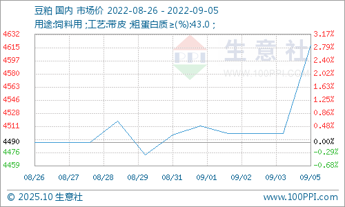 据生意社监测数据显示:8月末开始,利多支撑,豆粕行情回暖,振荡上行,一直上涨至9月。截止9月5日,豆粕市场均价4618元/吨,较8月26日上涨2.85%。